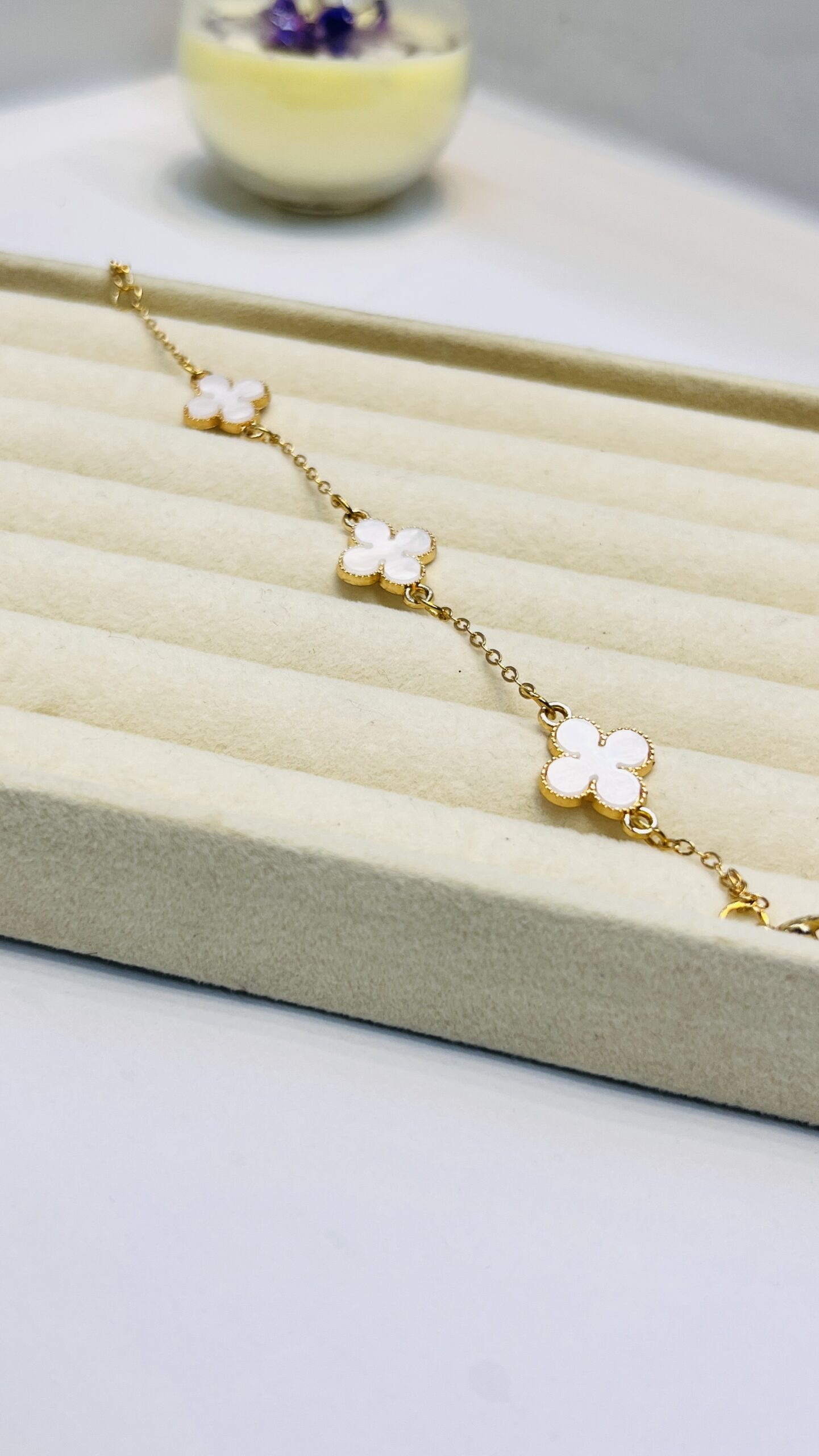 golden chain with white flower pattern bracelet