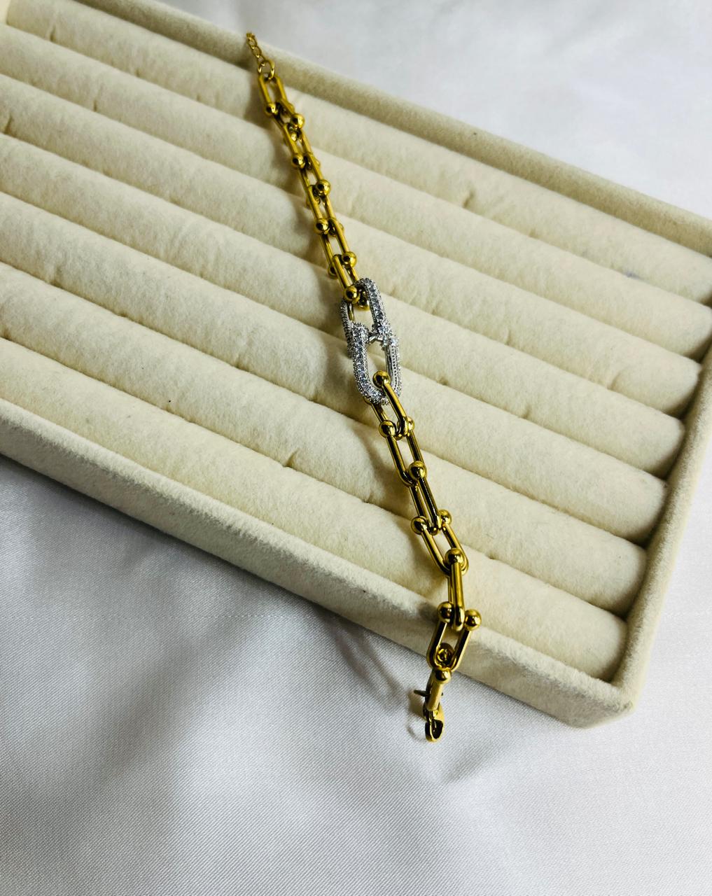 This bracelet redefines wristwear by masterfully integrating two worlds into one seamless circle. The foundation is a substantial, classic gold-tone chain—crafted in a robust curb, figaro, or cable link style—that provides a rich, luxurious frame designed to encircle the wrist with presence.