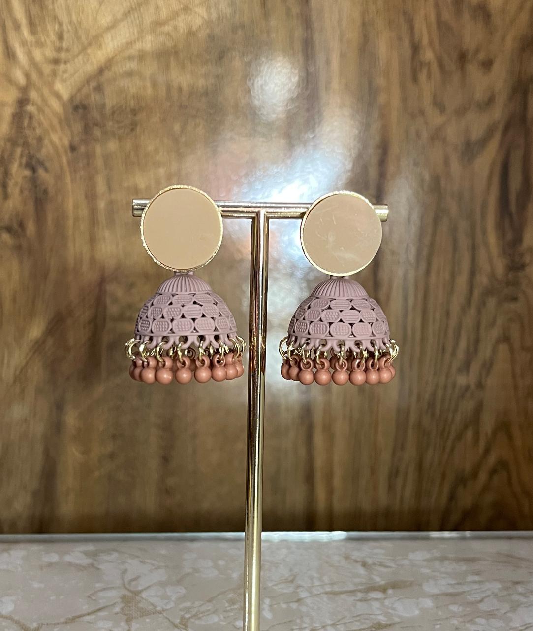 displayed on a gold metal earring stand. The earrings have a gold circular backing with a pink conical jhumka featuring intricate lattice cutouts.