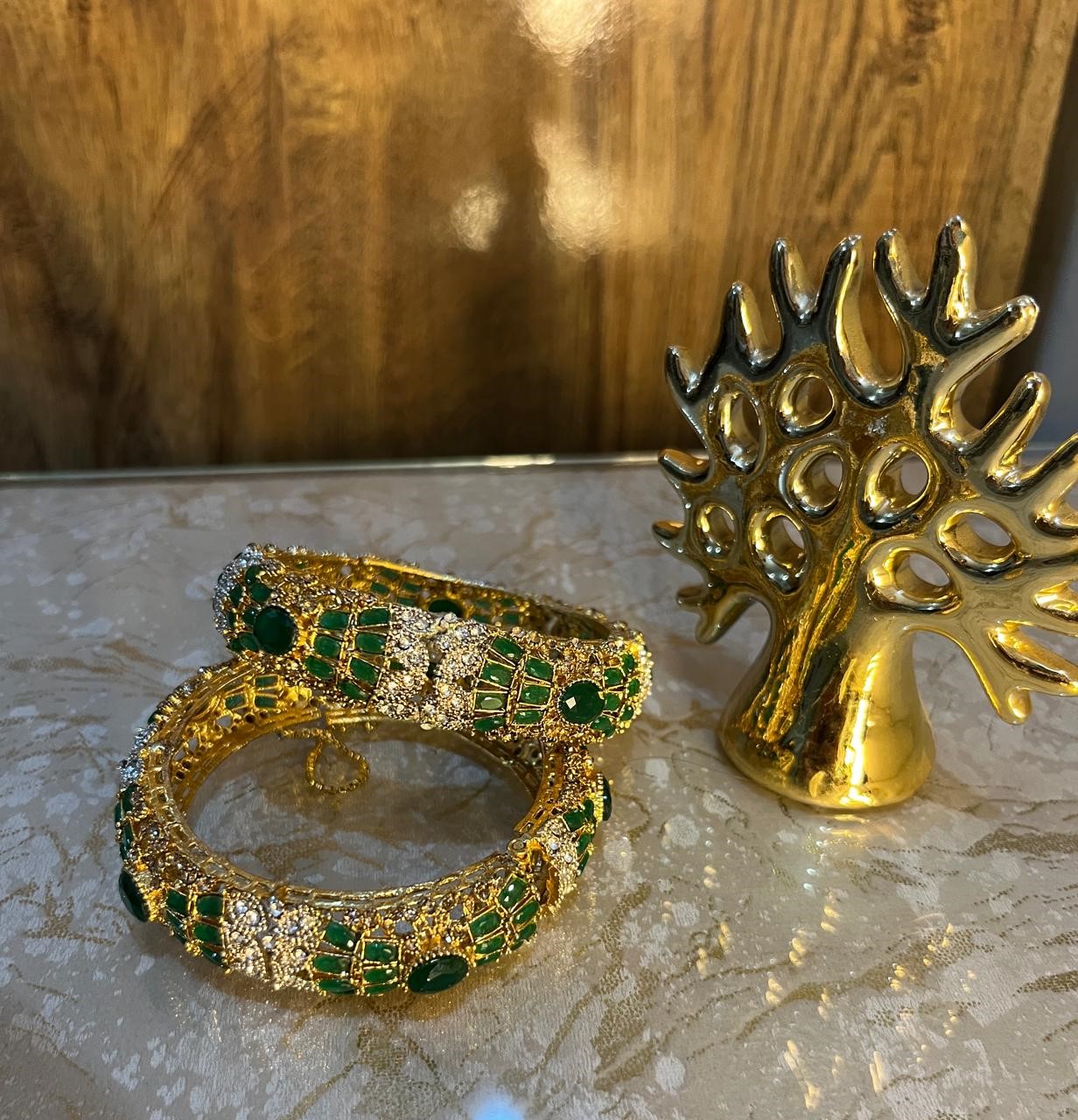Elegant gold‑plated bangles set with emerald‑green stones and sparkling zirconia accents,