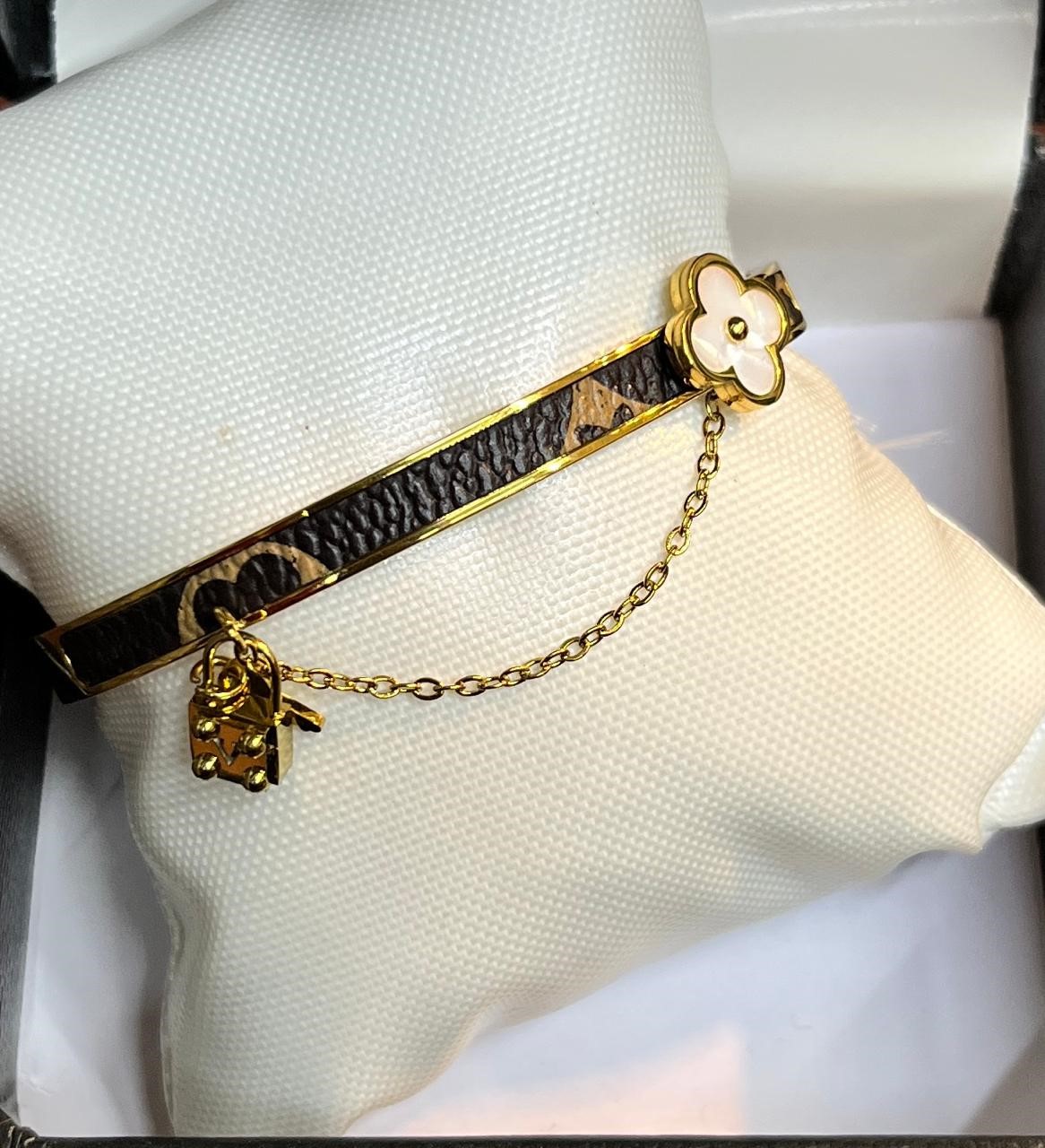 featuring a sleek textured bar, delicate flower detail, and charming lock accent. A perfect blend of luxury and modern style for everyday wear or special occasions.