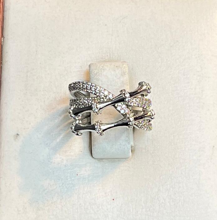 The ring rests on a white rectangular jewelry holder, highlighting its detailed craftsmanship and elegant design.