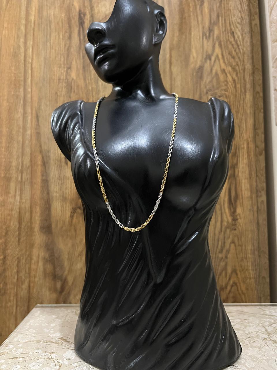 With a sleek, twisted link design. It drapes elegantly on the mannequin, giving a luxurious, layered metallic look.