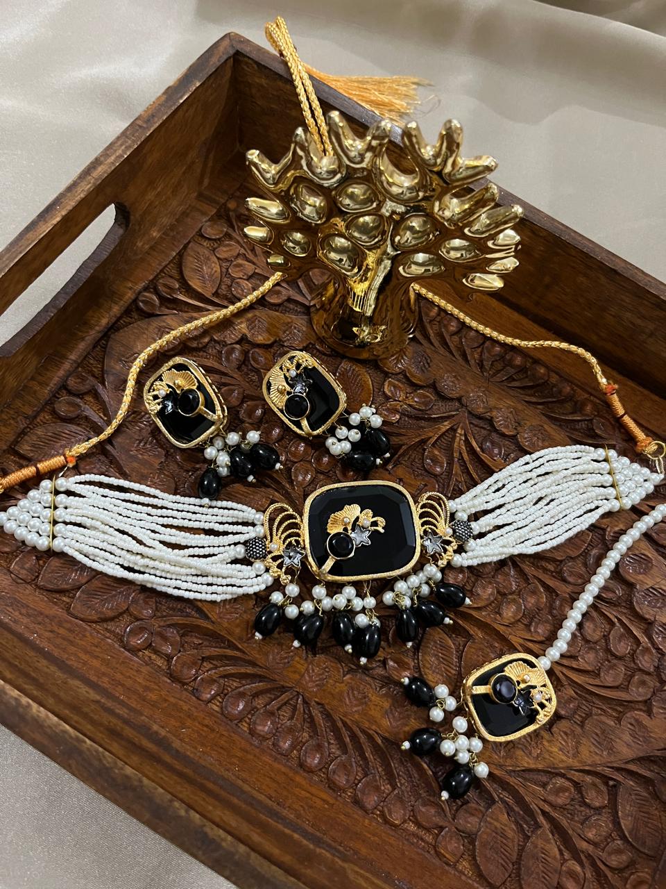 paired with matching jhumka earrings featuring black stones and pearl accents.